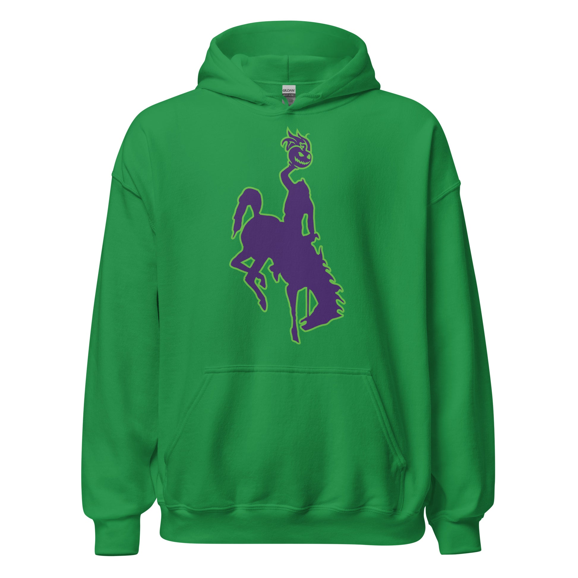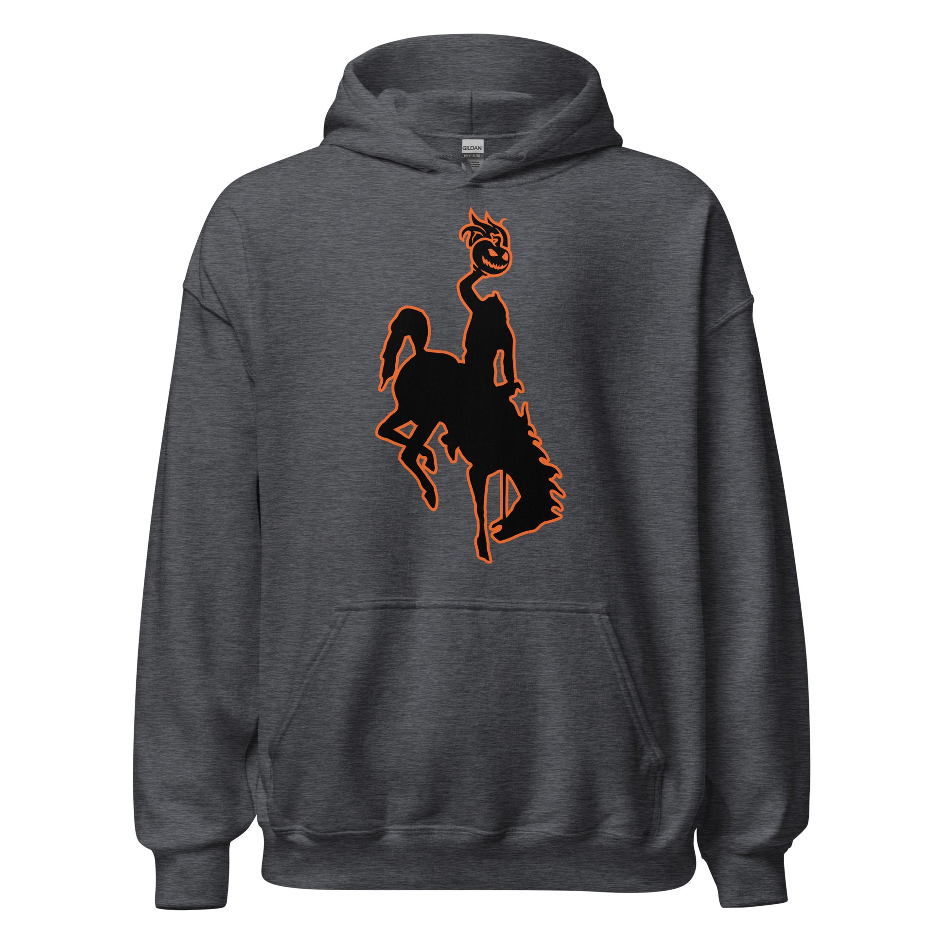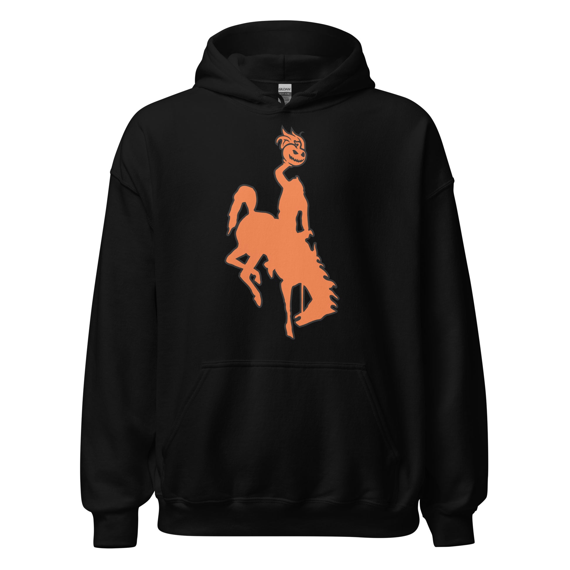 Gather around and I'll elucidate about what goes on in Wyoming when it gets late. It's a frightful sight to see what goes on Halloween Night! The Headless Horseman he's the worst, he rides one night a year to find a head in Wyoming here!... The back of the hoodie includes the following phrase