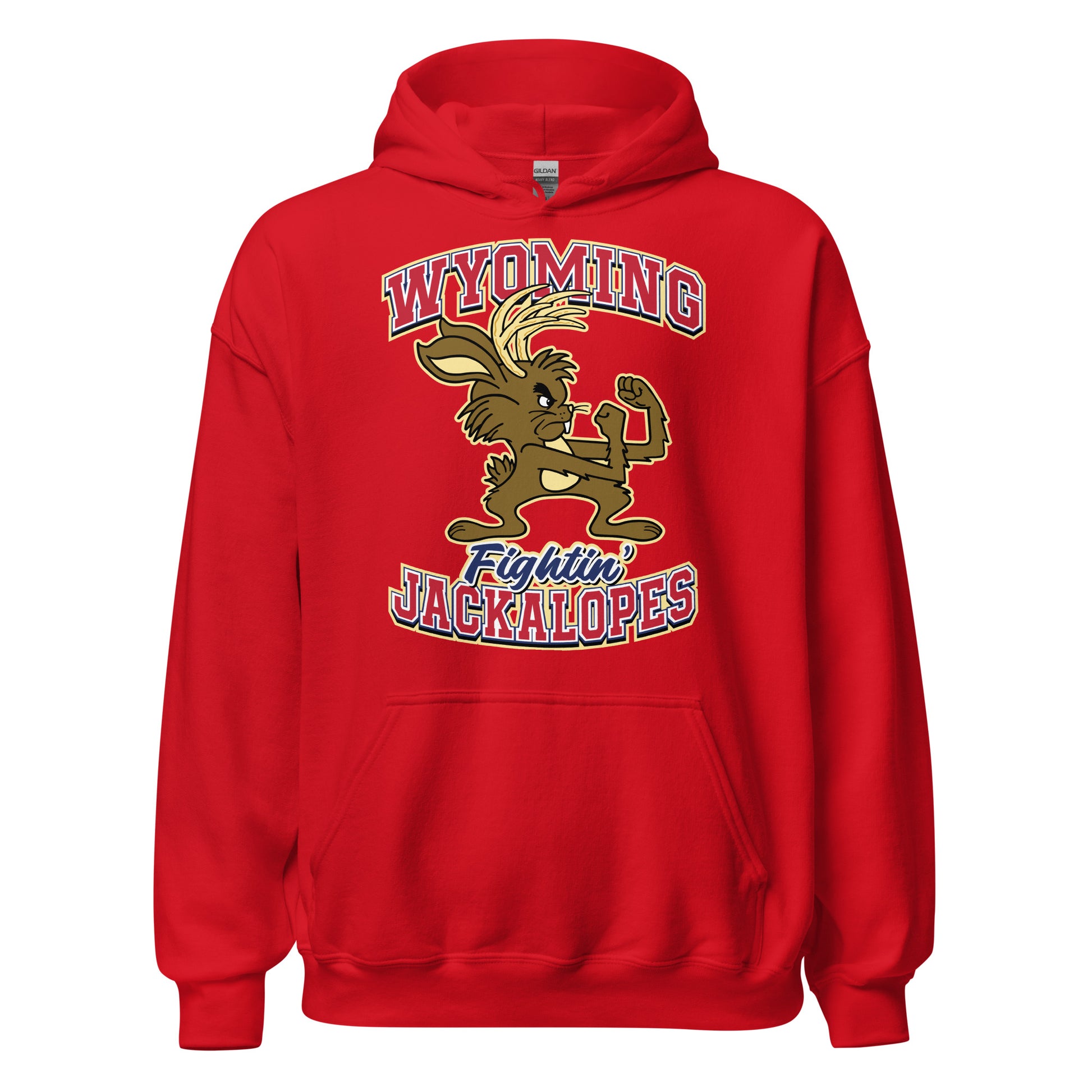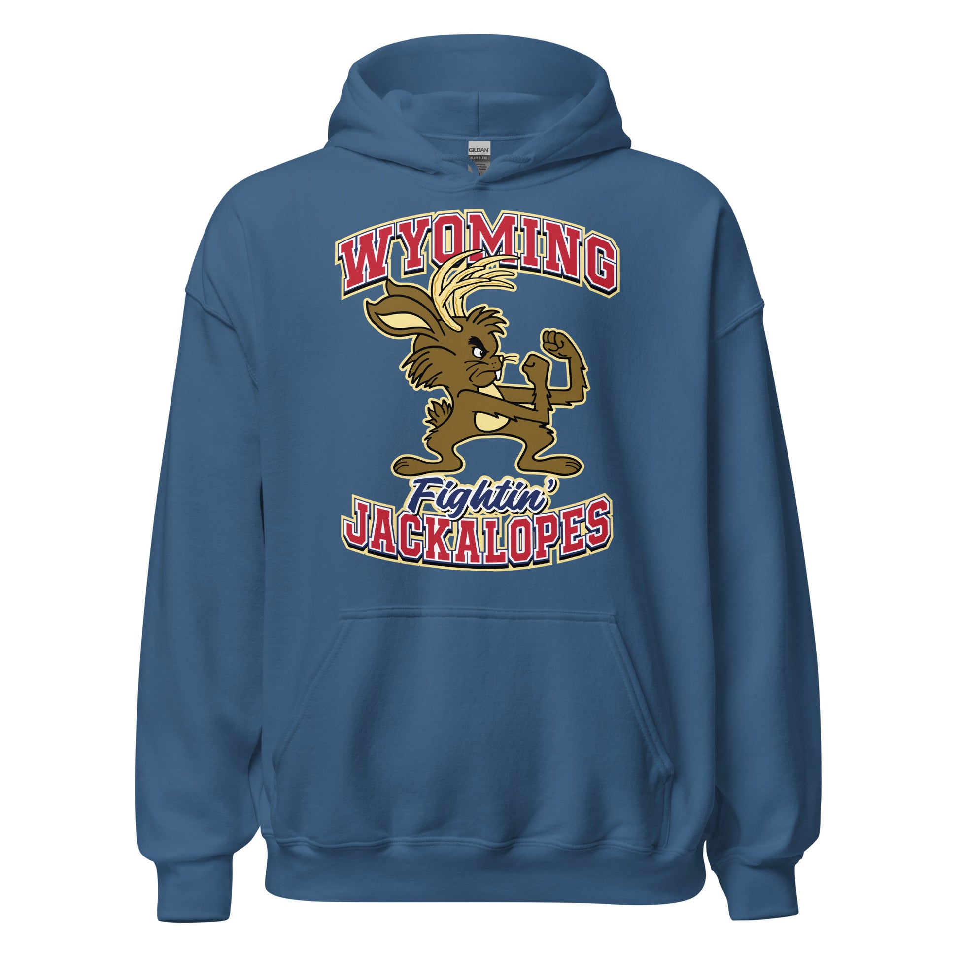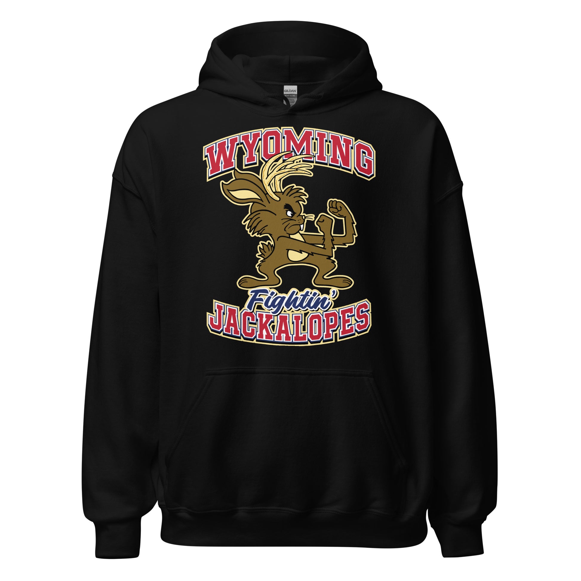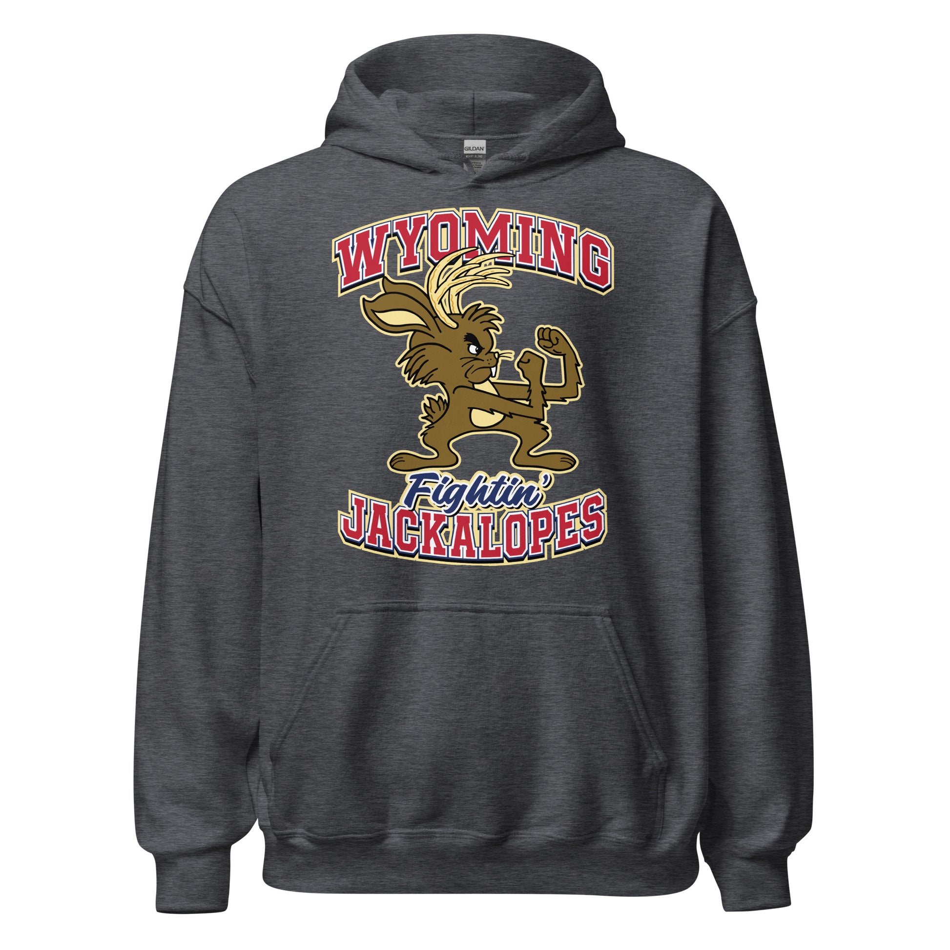 The Fightin’ Jackalopes are the State of Wyoming’s team right after The Cowboys and fan’s local high schools! The support for the Lopes is tepid but skyrocketing to lukewarm! Show your support for the team with a Fightin’ Jackalopes Hoodie! The back features the following