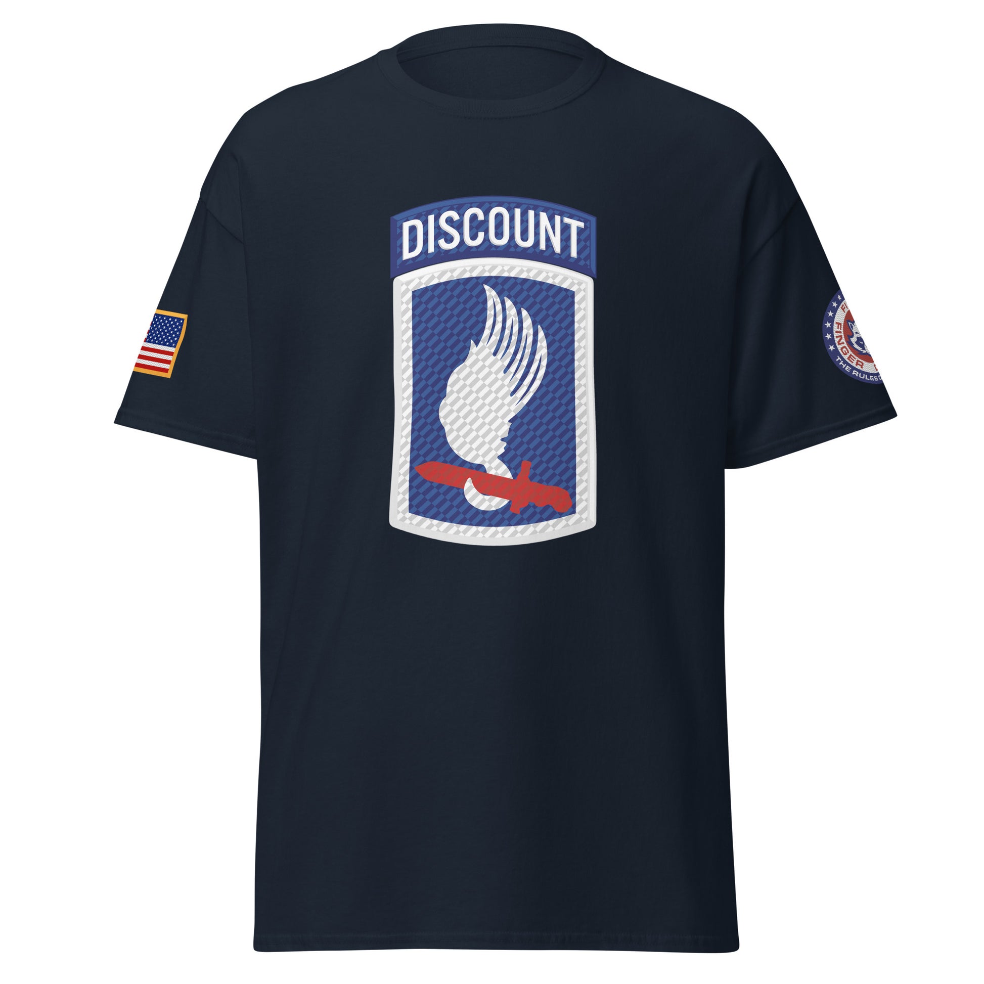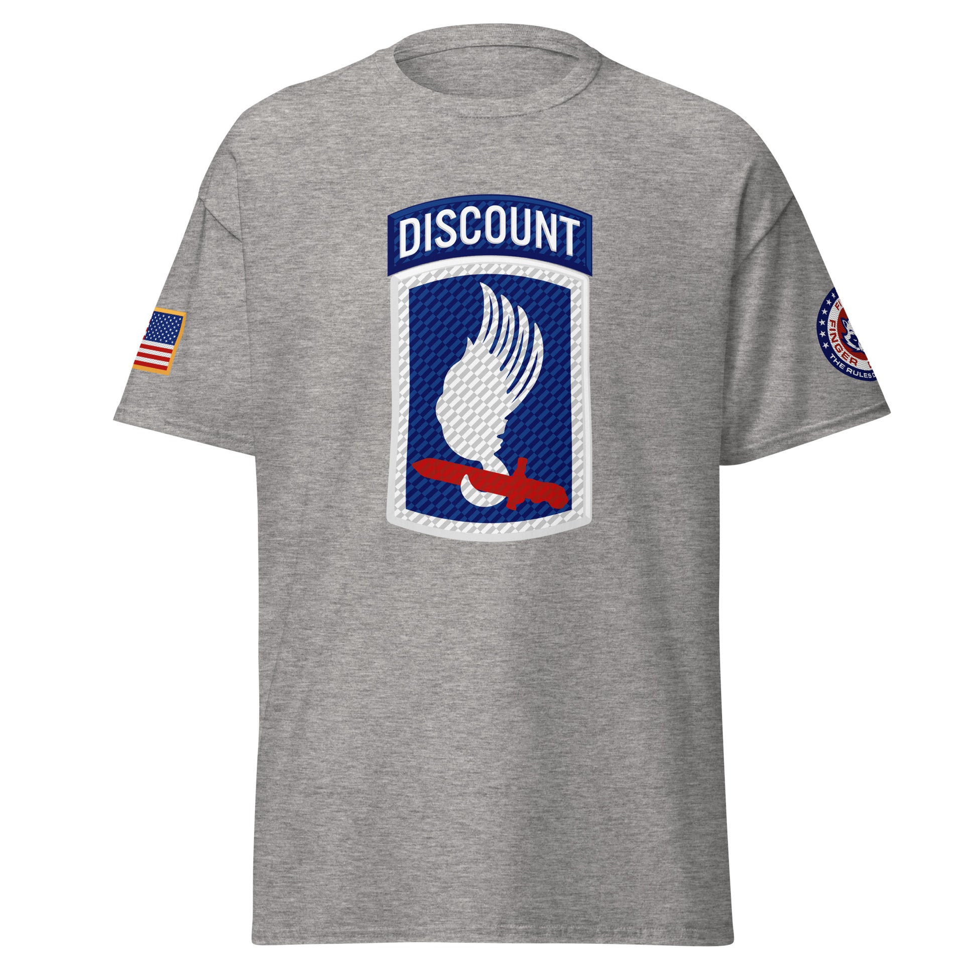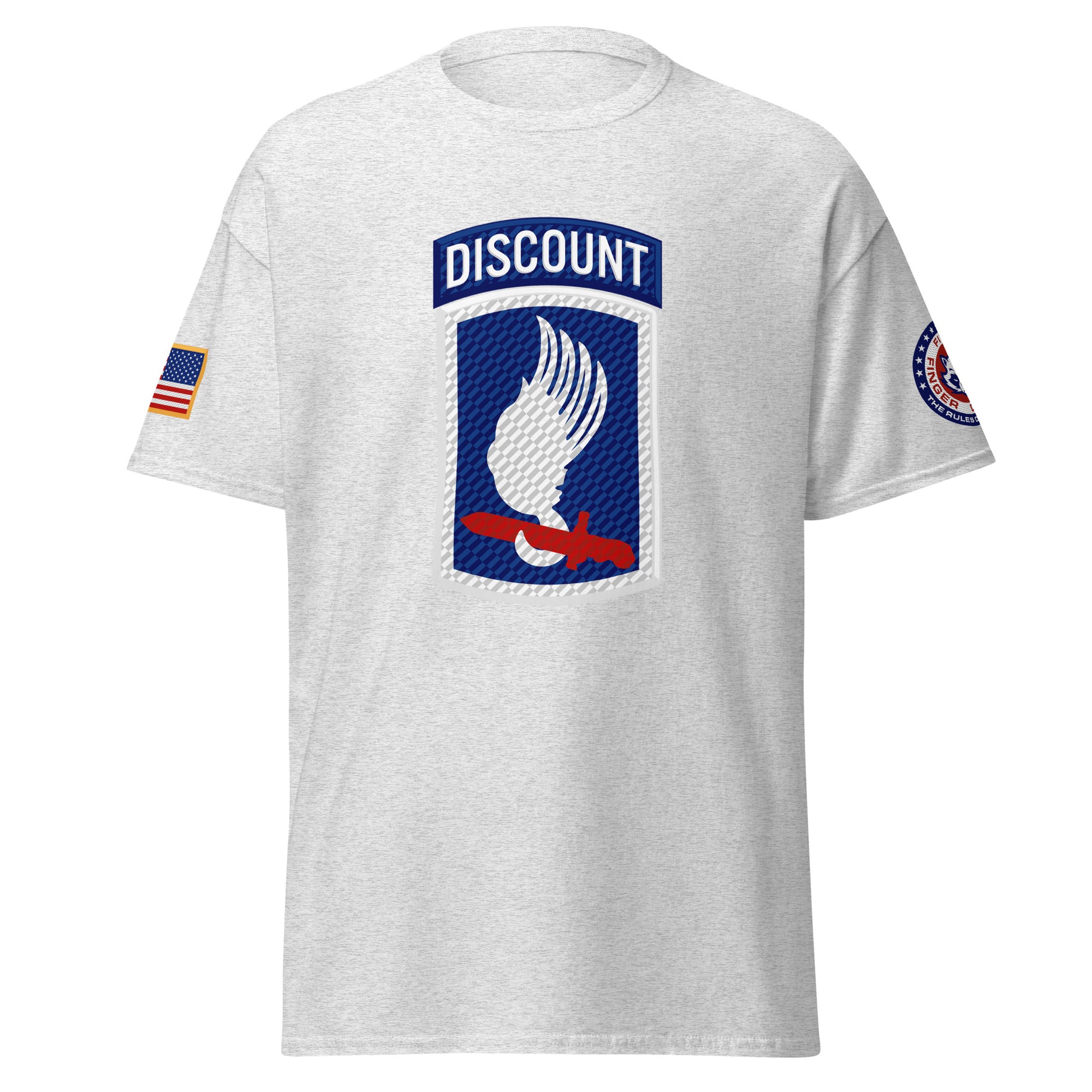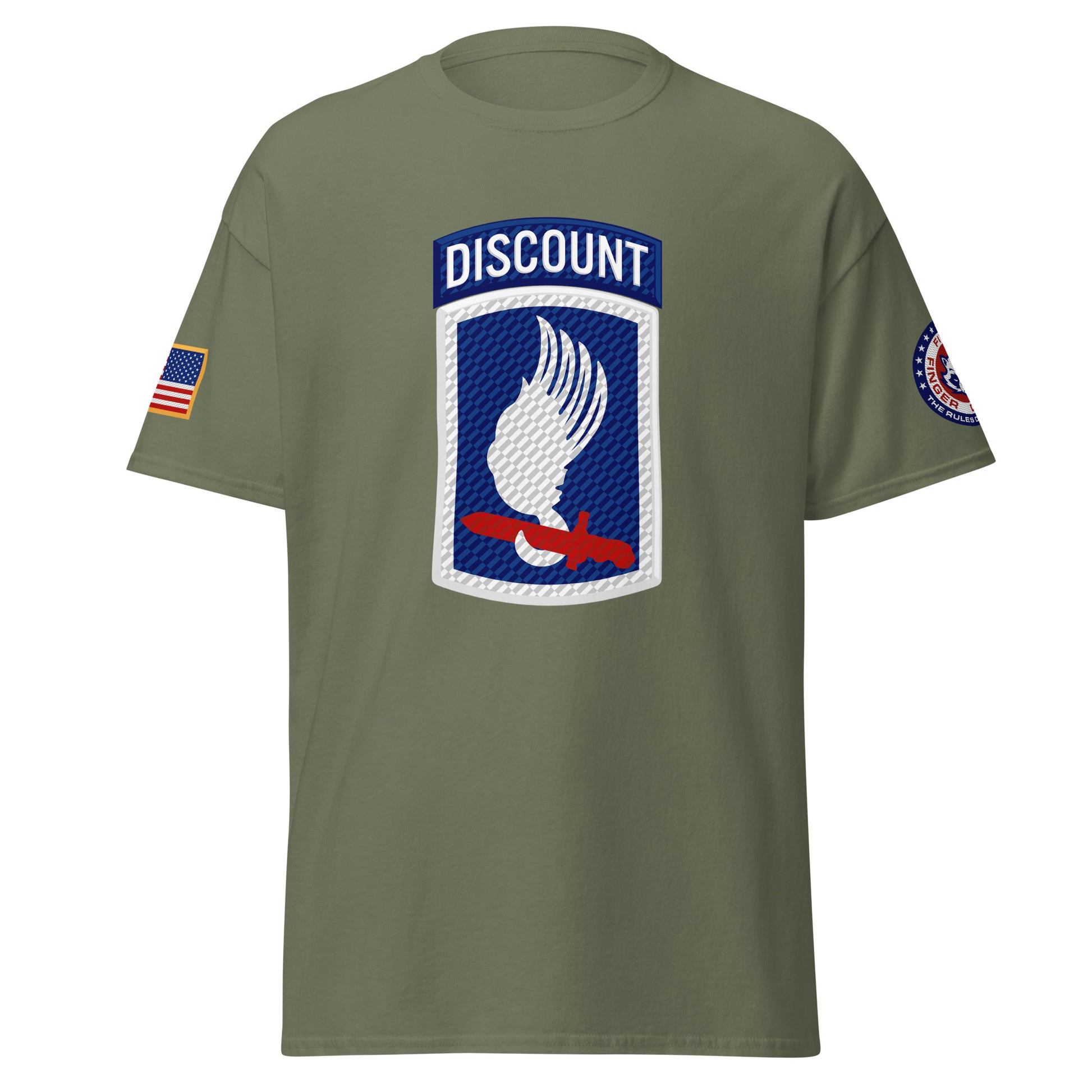 Sky Soldiers! Based on the famed 173rd Airborne shoulder sleeve insignia patch, with a Five Finger Discount twist. Featuring the American flag on the right shoulder and Five Finger Discount branding on the left shoulder.