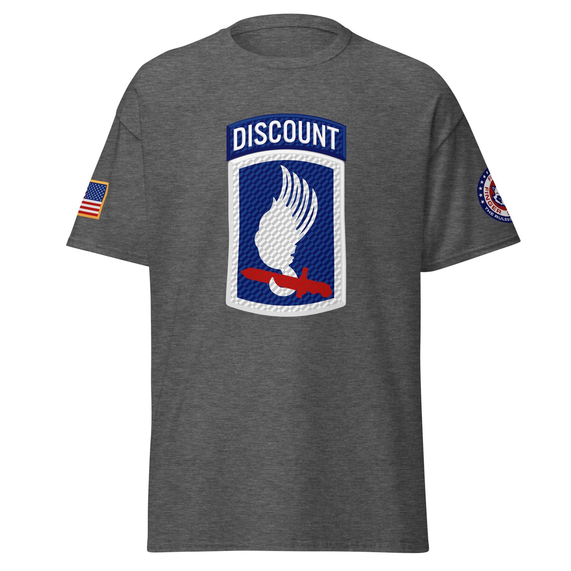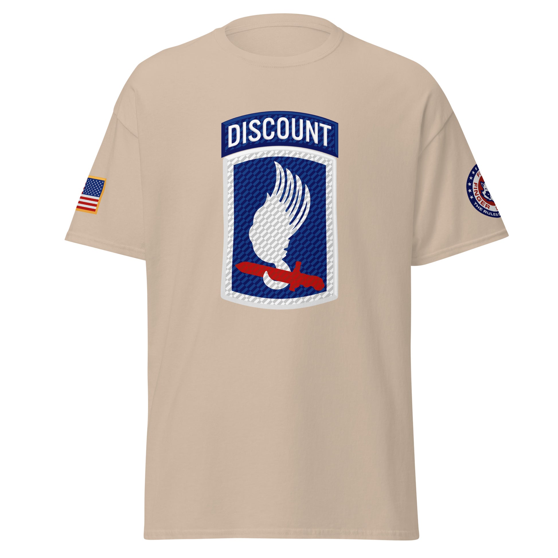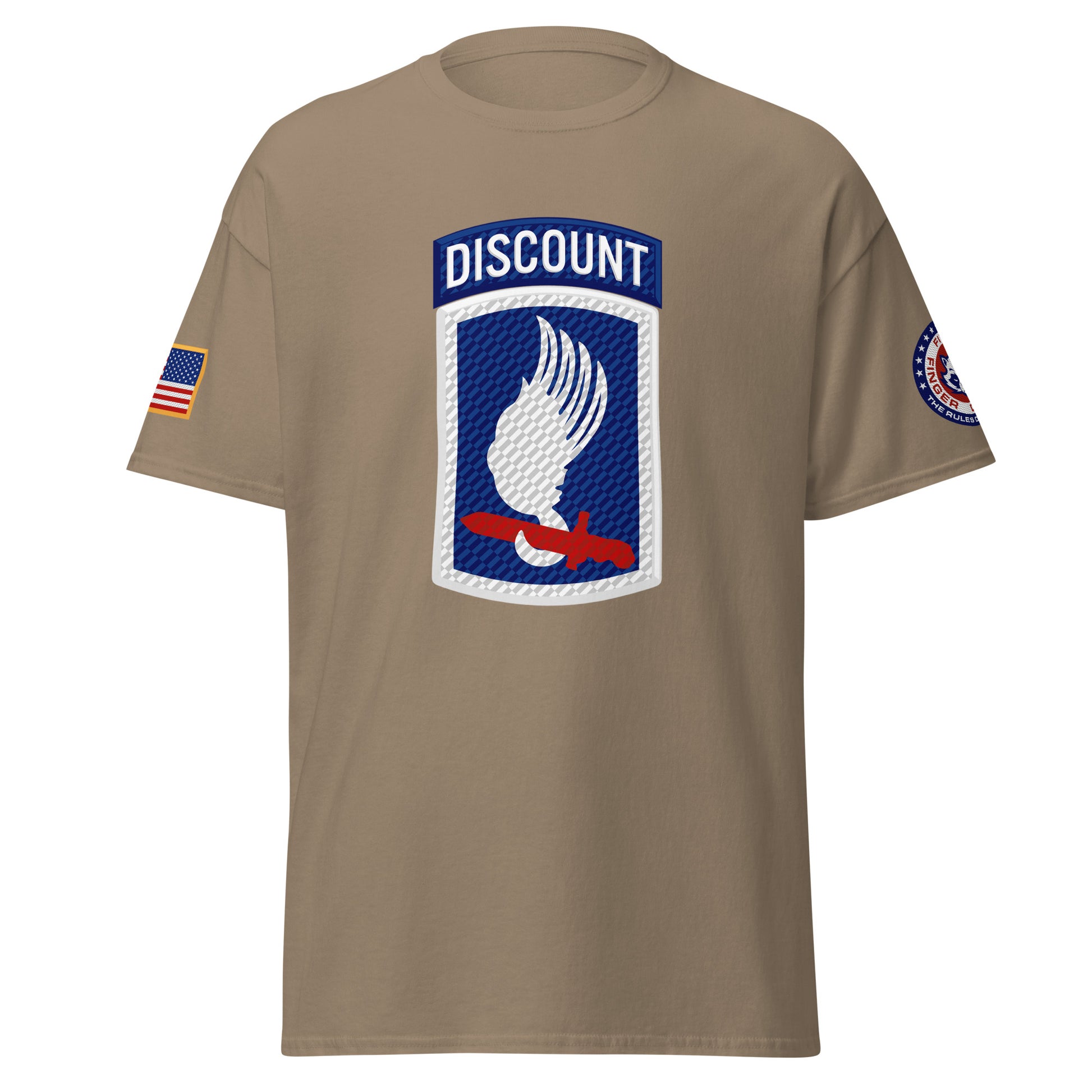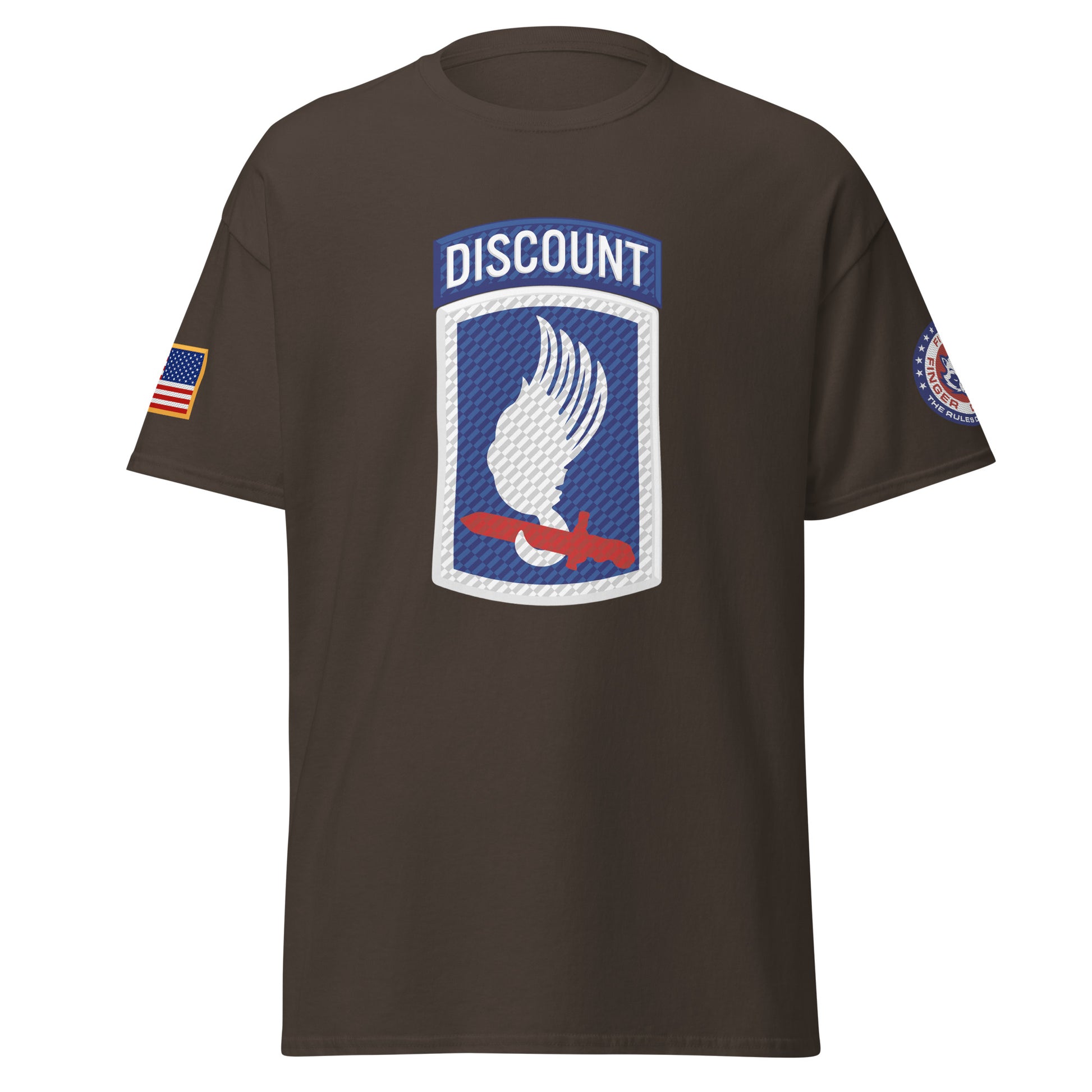 Sky Soldiers! Based on the famed 173rd Airborne shoulder sleeve insignia patch, with a Five Finger Discount twist. Featuring the American flag on the right shoulder and Five Finger Discount branding on the left shoulder.