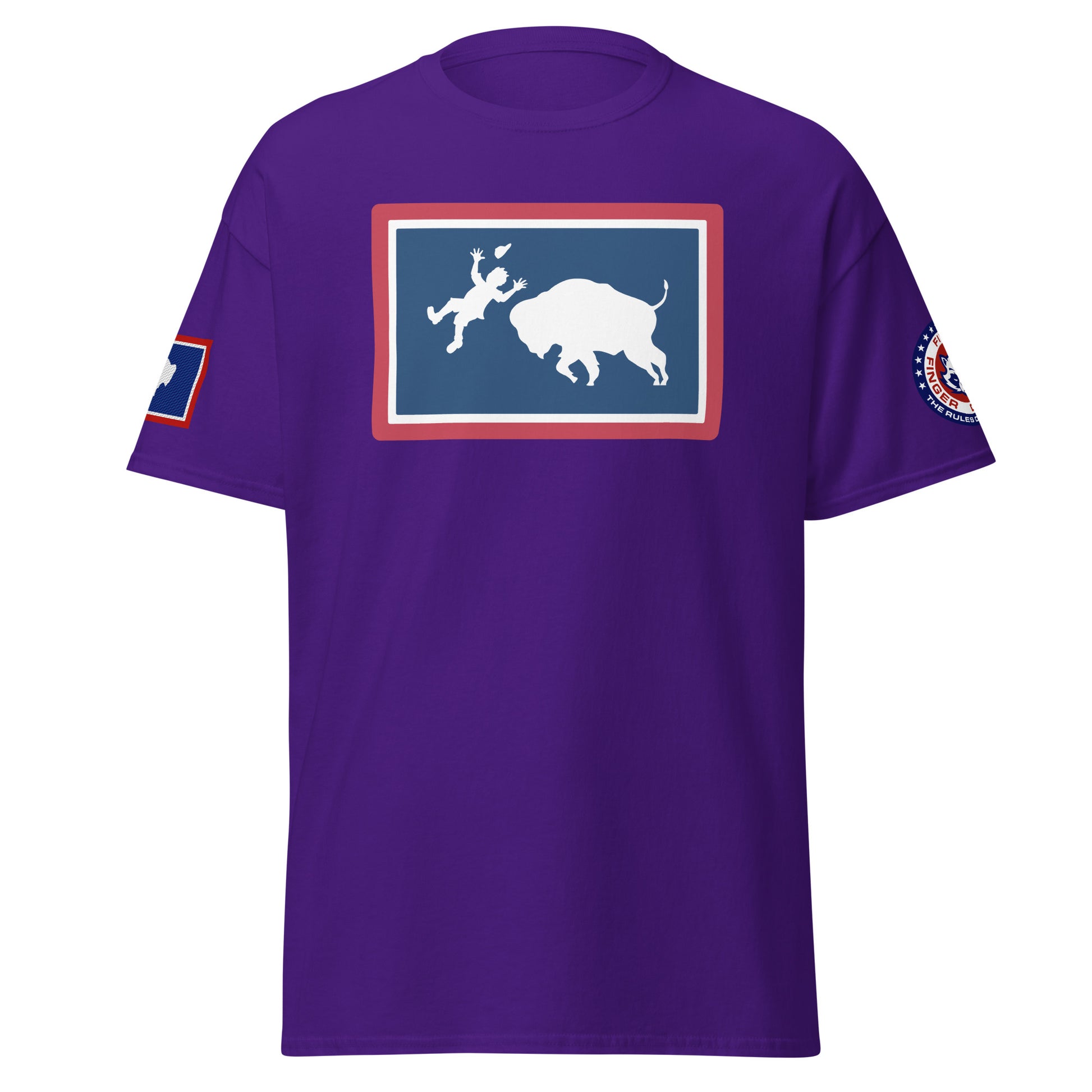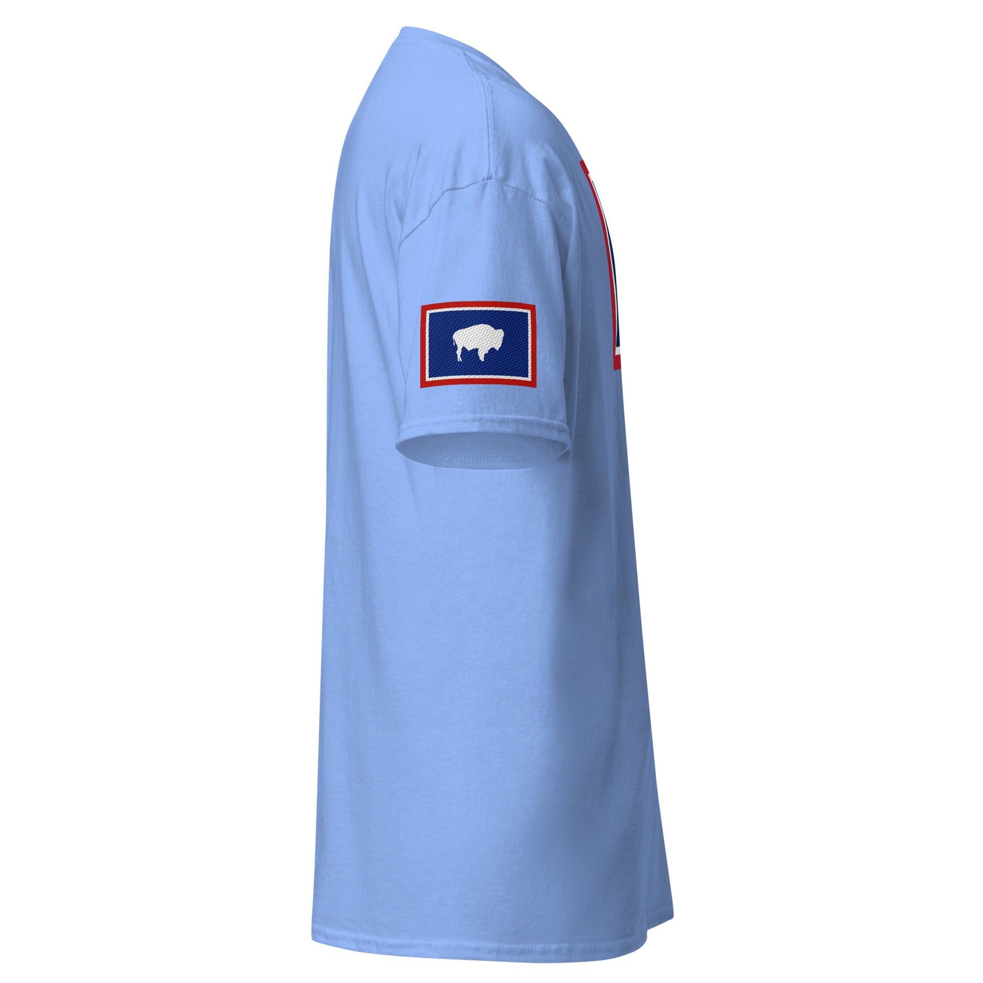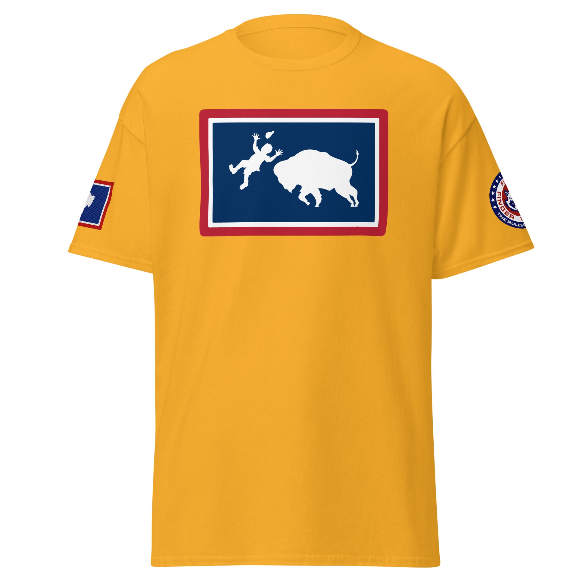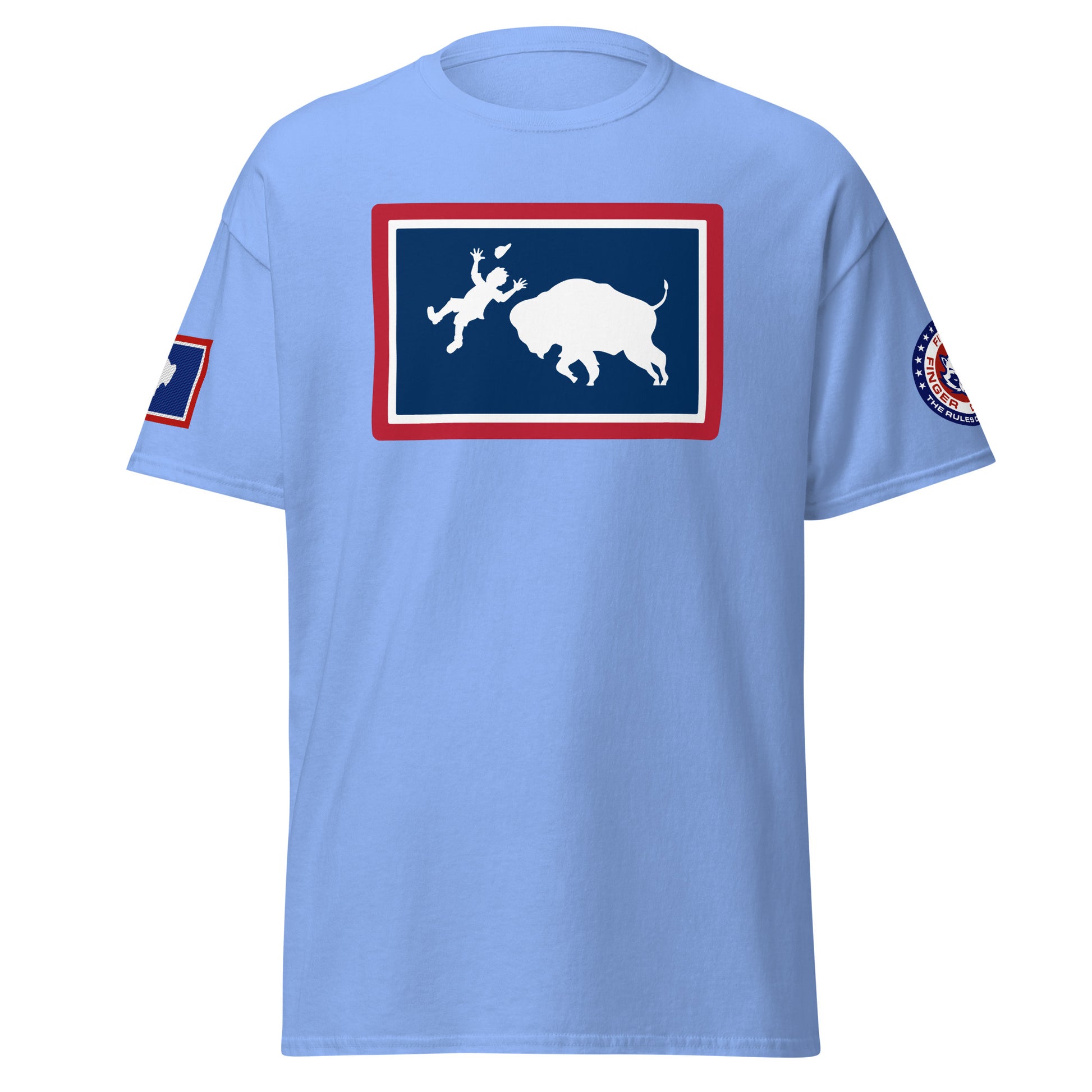 Welcome to Wonderful Wyoming! The wild life in Wyoming's State and National Parks are very docile so much so that these parks could be viewed as petting zoos! This design was inspired by the Wyoming State flag and interactions between tourists and Wyoming's wildlife. Get out your selfie sticks and start making content!