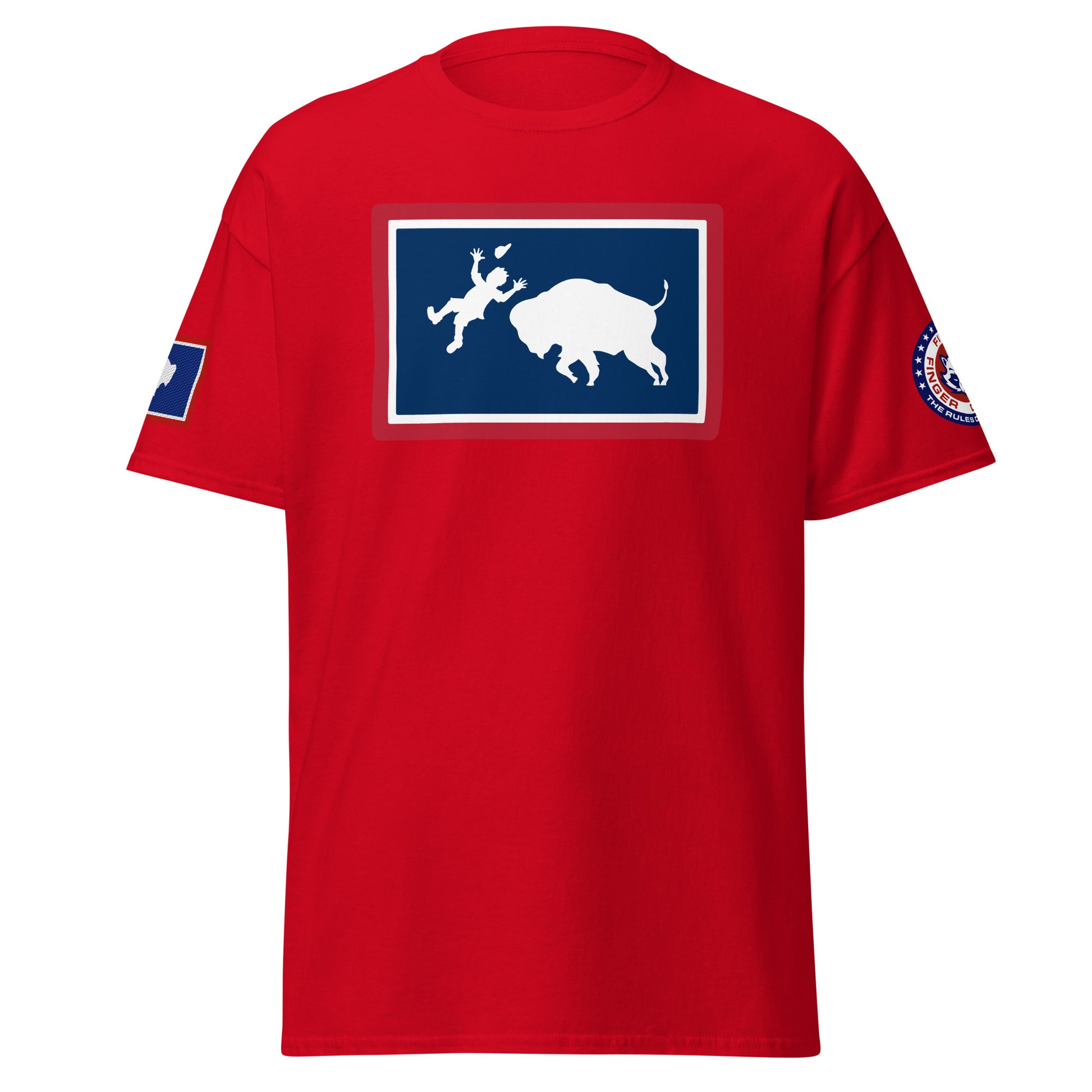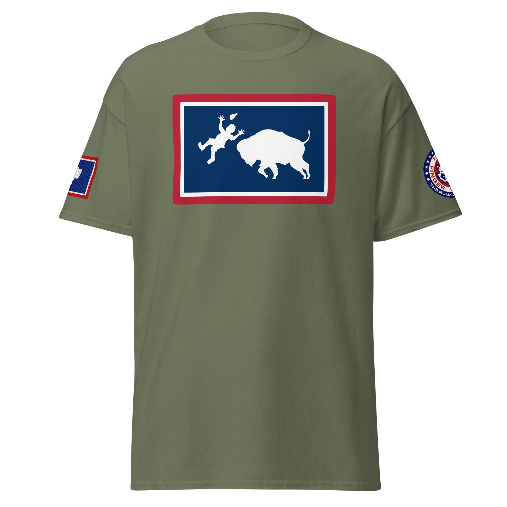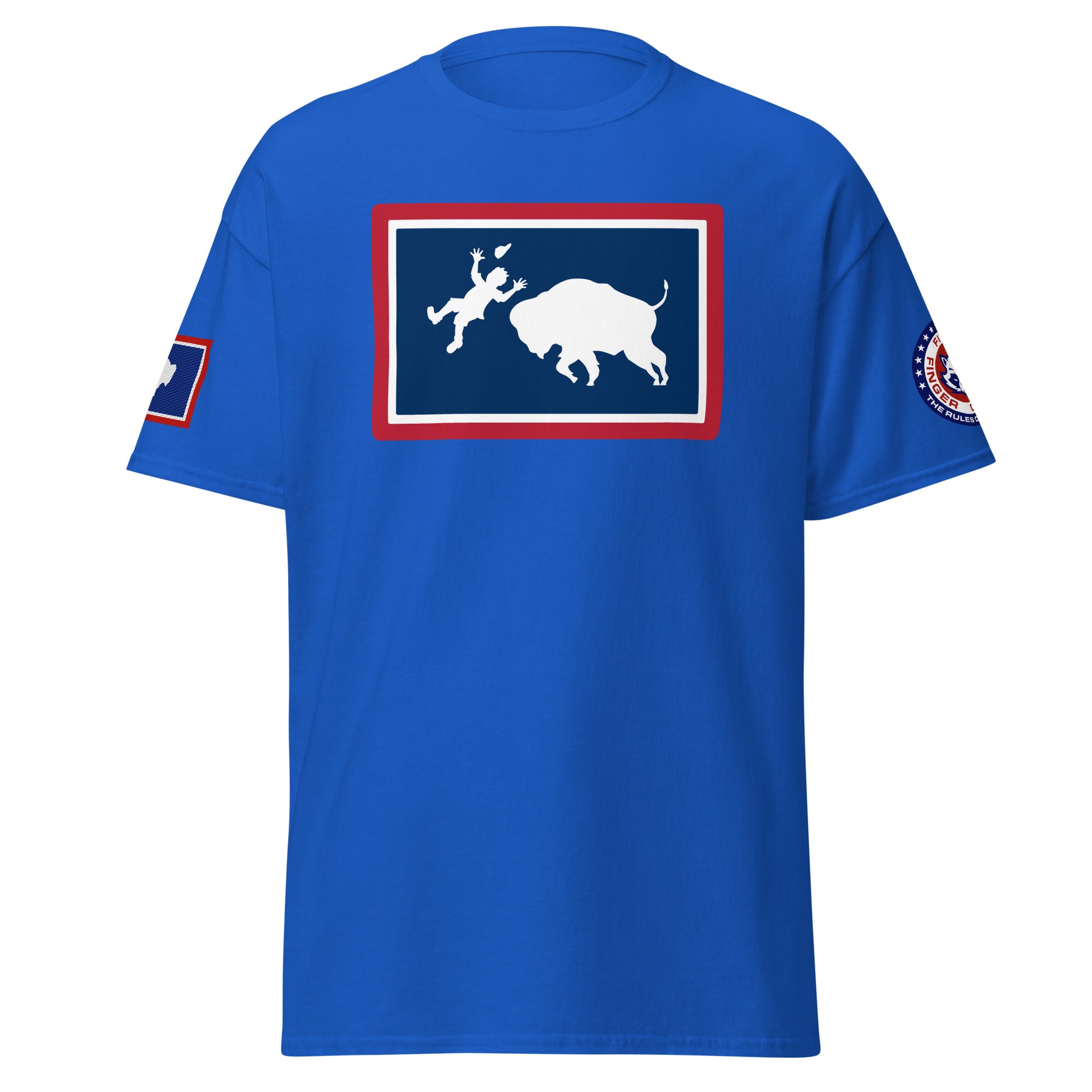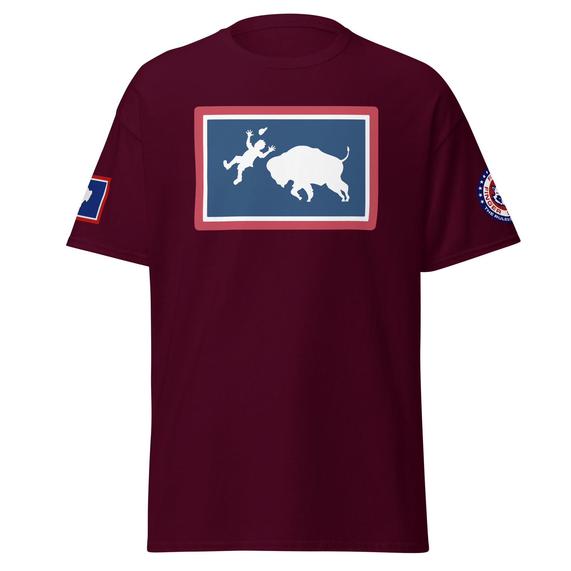 Welcome to Wonderful Wyoming! The wild life in Wyoming's State and National Parks are very docile so much so that these parks could be viewed as petting zoos! This design was inspired by the Wyoming State flag and interactions between tourists and Wyoming's wildlife. Get out your selfie sticks and start making content!