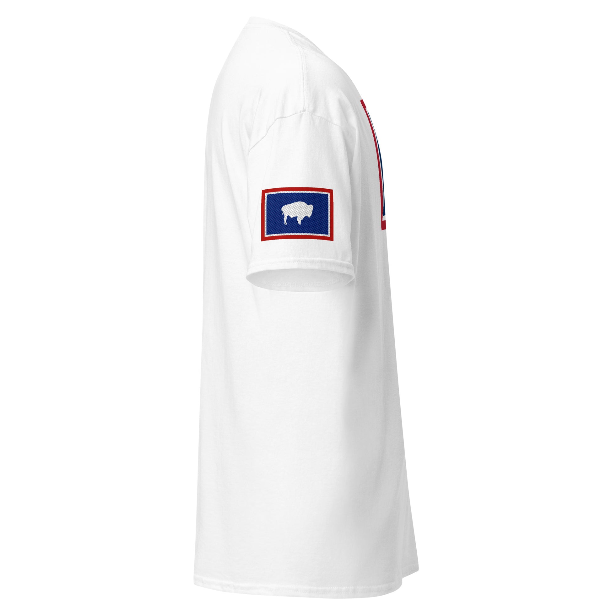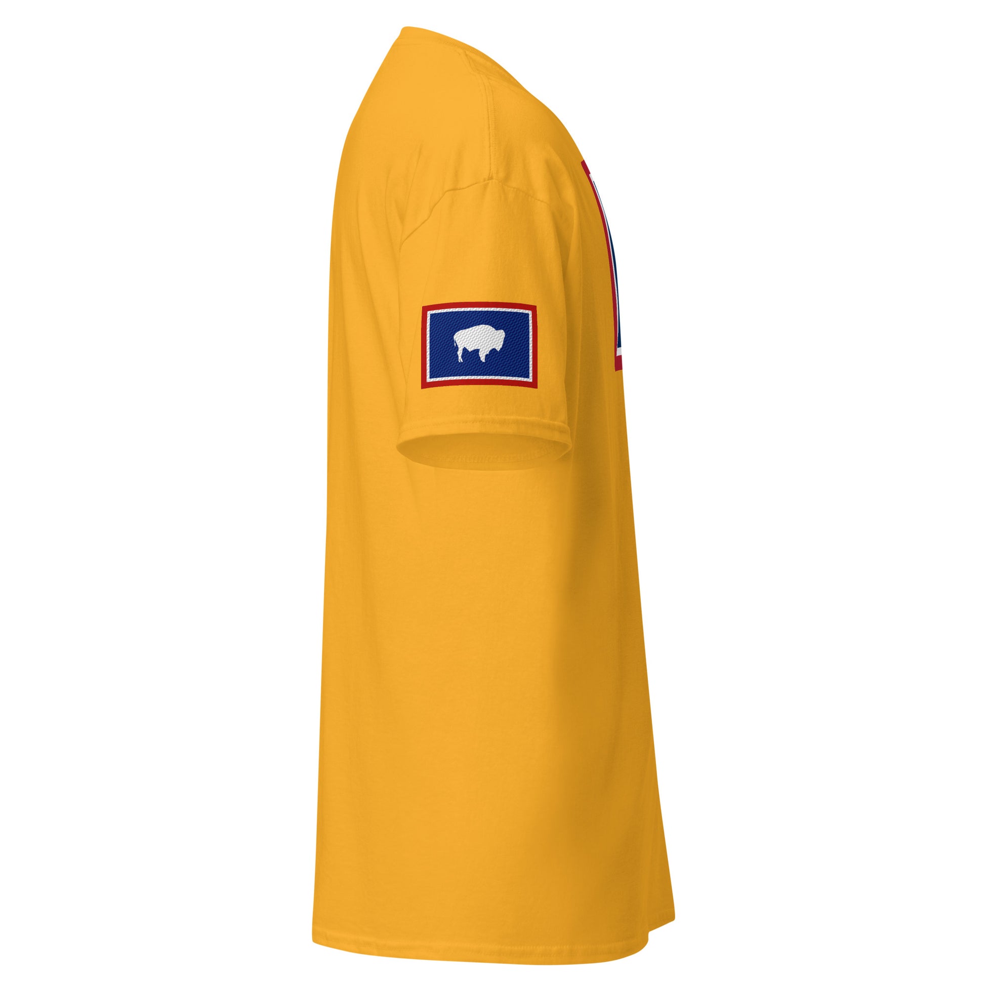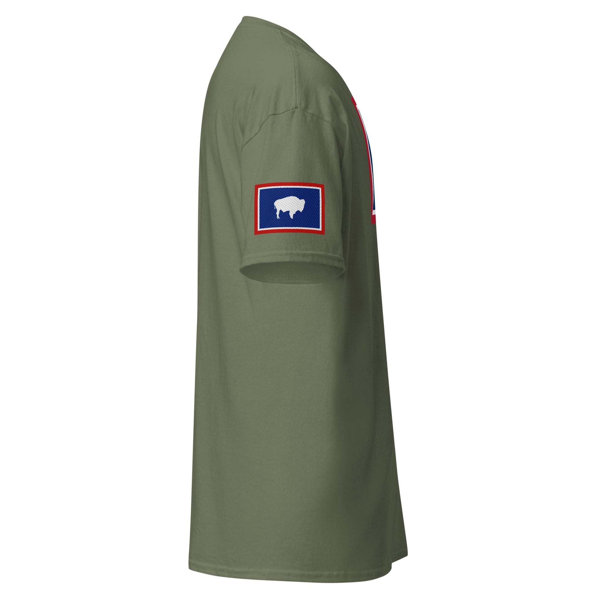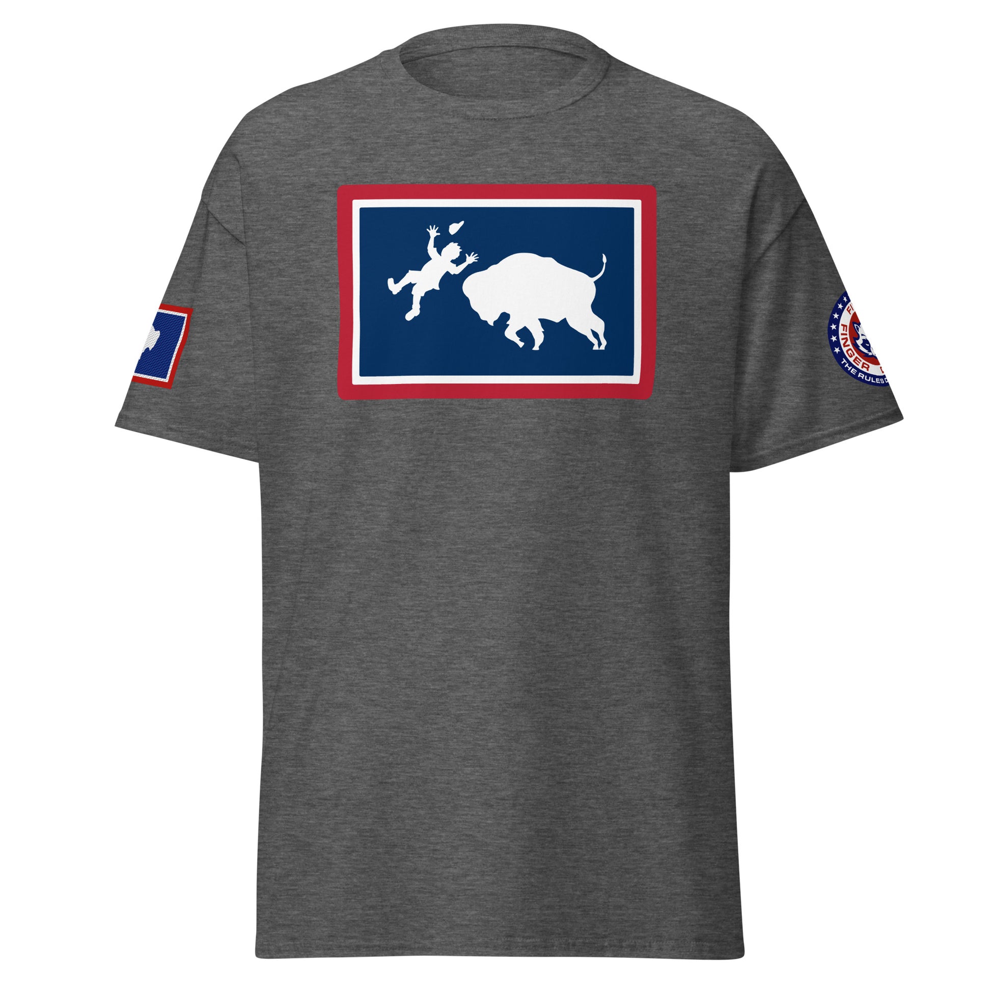 Welcome to Wonderful Wyoming! The wild life in Wyoming's State and National Parks are very docile so much so that these parks could be viewed as petting zoos! This design was inspired by the Wyoming State flag and interactions between tourists and Wyoming's wildlife. Get out your selfie sticks and start making content!