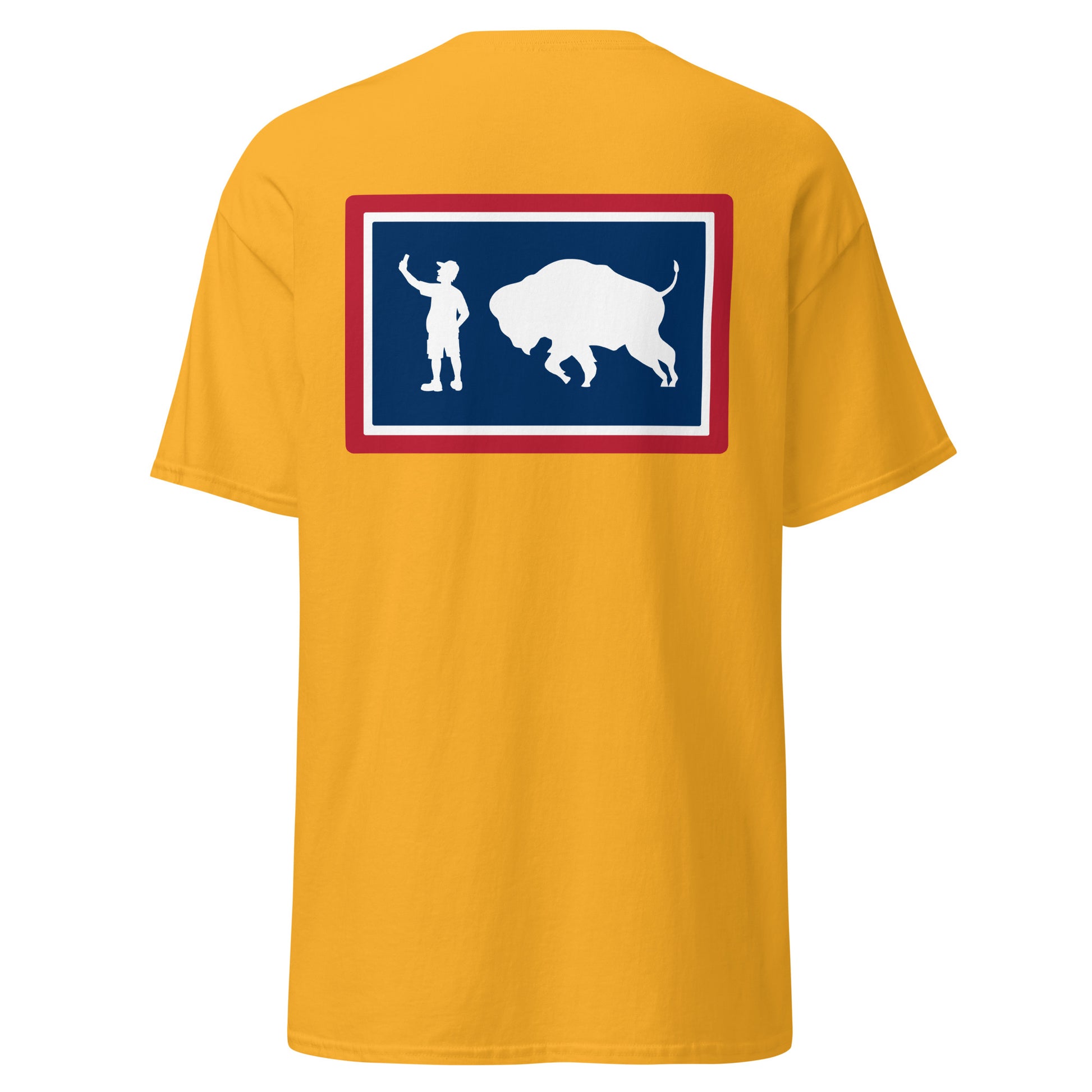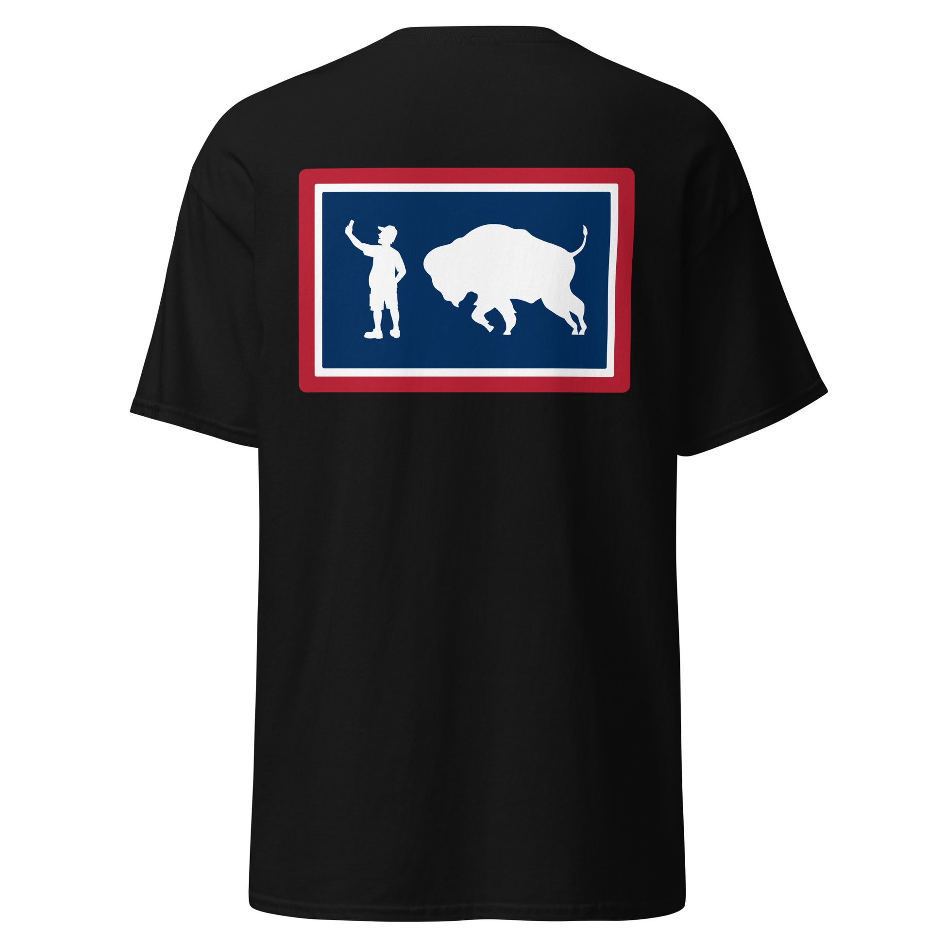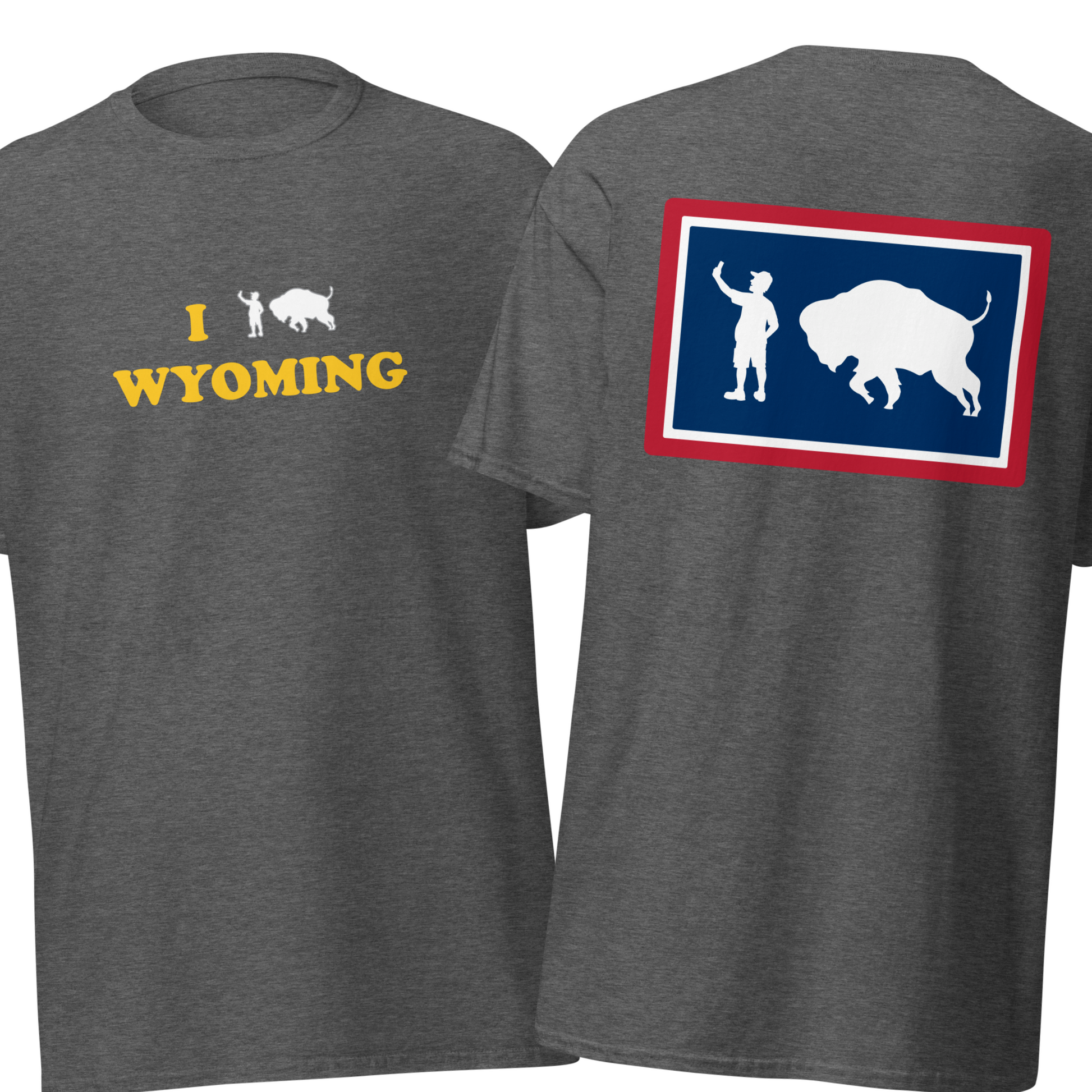 I went to Yellowstone National Park attempted to pet the fluffy cow and ended up with a fine, hefty medical bills and this awesome Five Finger Discount T-Shirt! You can avoid the fine and medicals bills and simply order it from us! The back of the shirt features our twist on the Wyoming state flag with the buffalo charging an unsuspecting fella snapping a selfie!