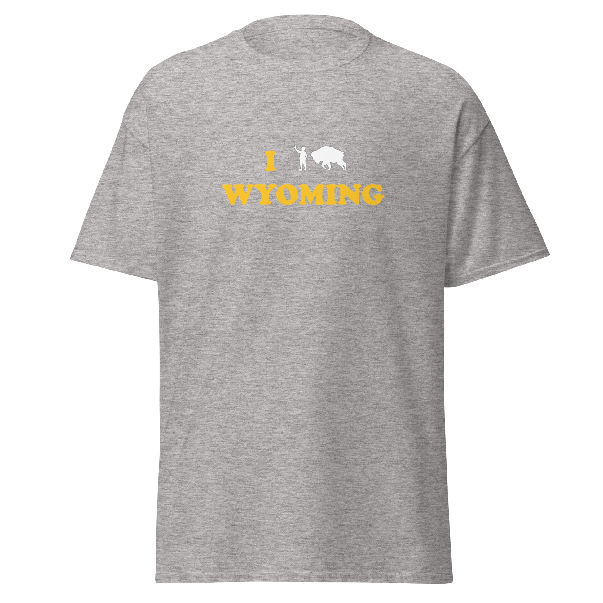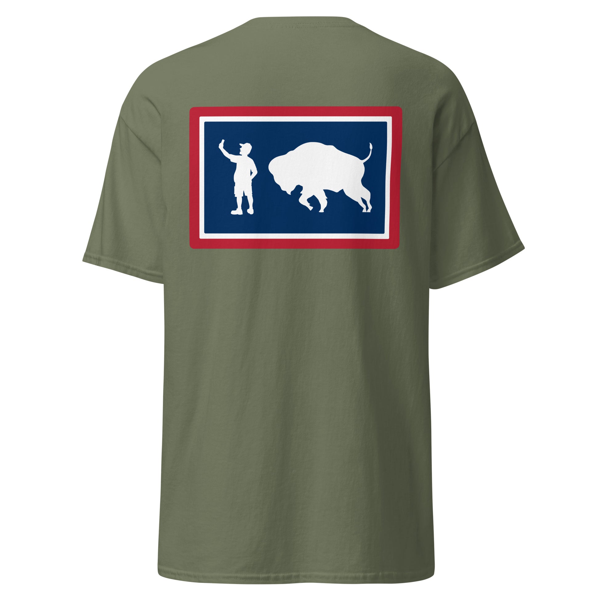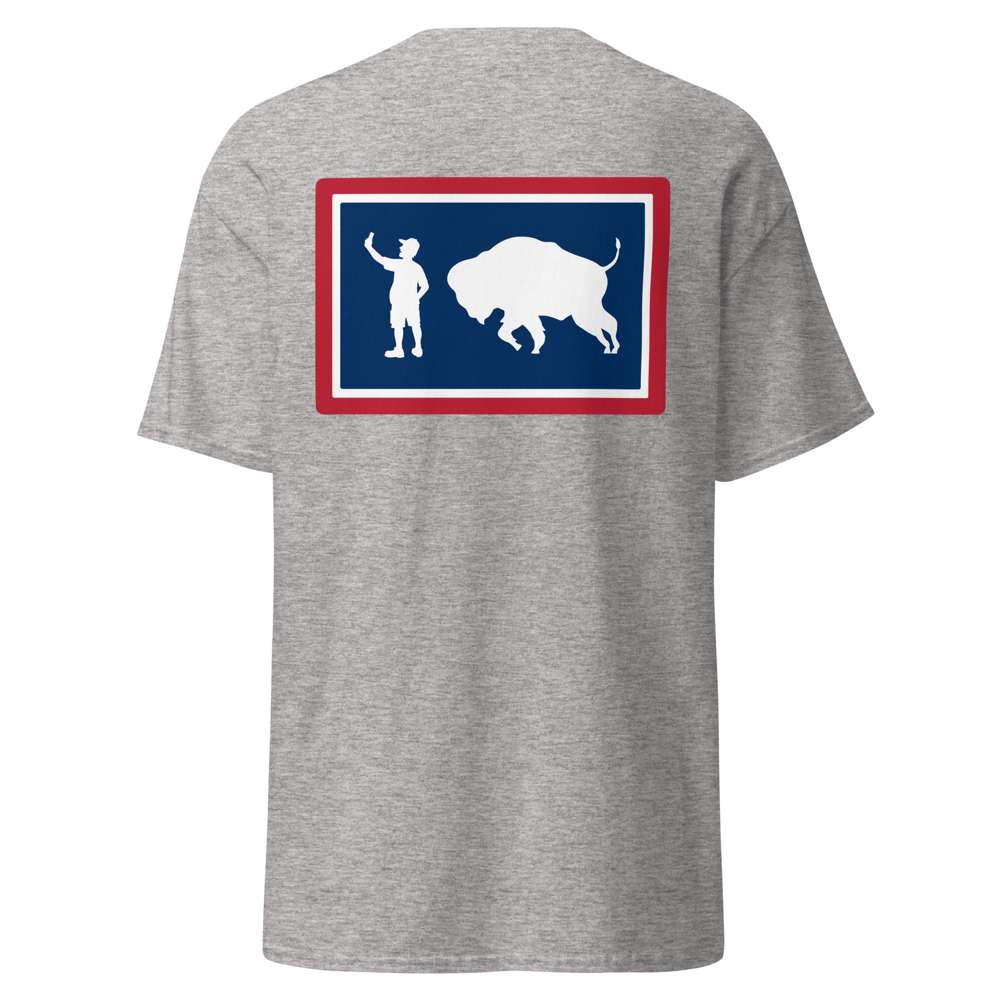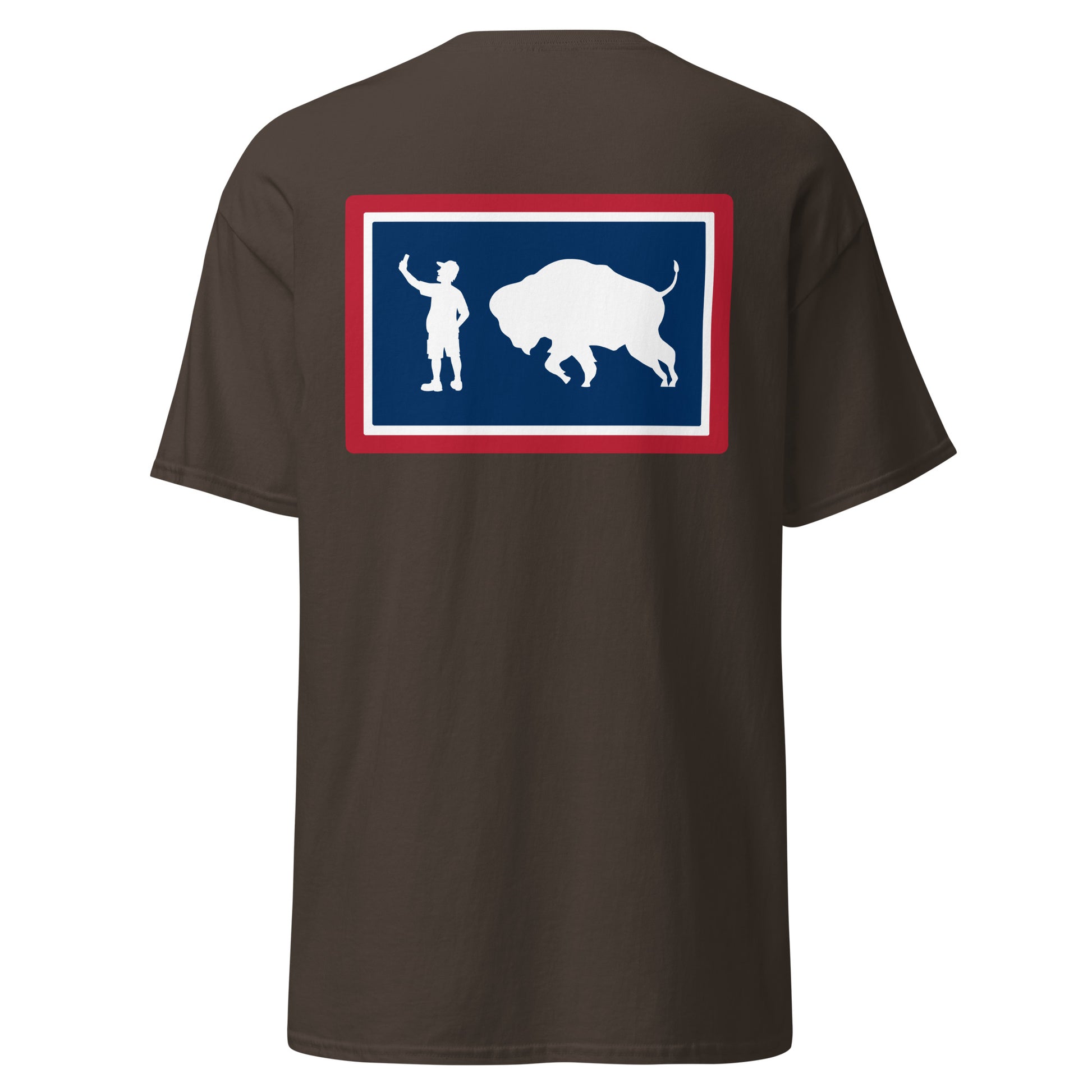 I went to Yellowstone National Park attempted to pet the fluffy cow and ended up with a fine, hefty medical bills and this awesome Five Finger Discount T-Shirt! You can avoid the fine and medicals bills and simply order it from us! The back of the shirt features our twist on the Wyoming state flag with the buffalo charging an unsuspecting fella snapping a selfie!