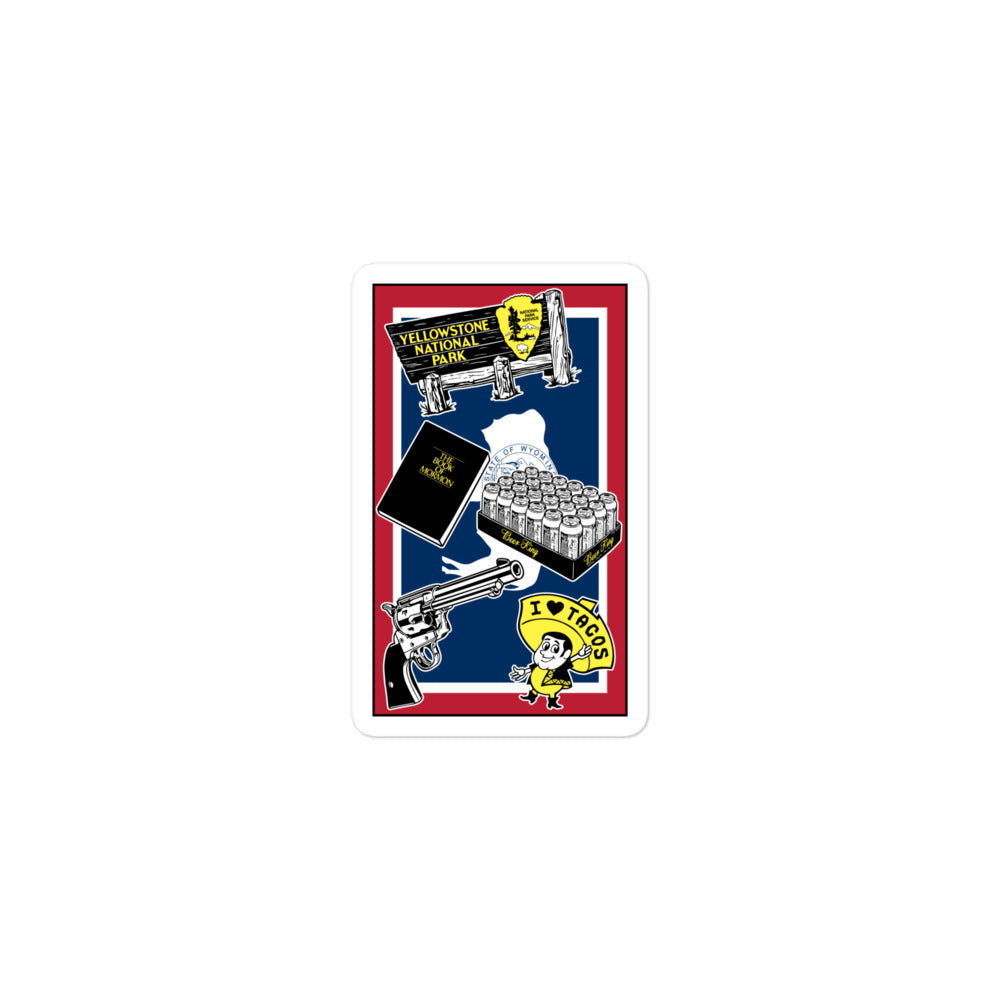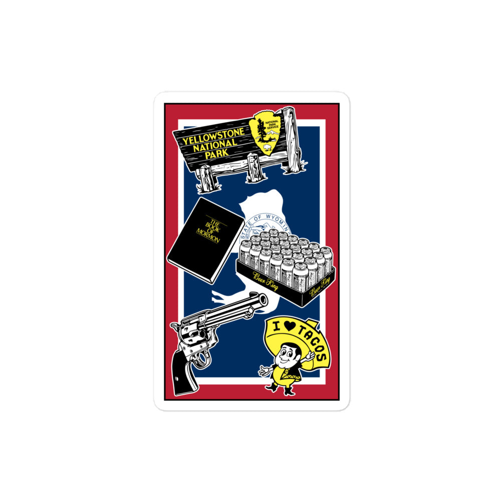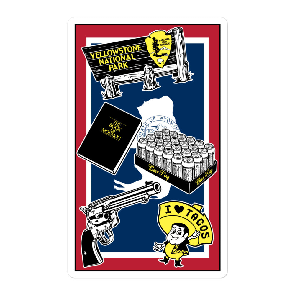 Load up your six shooter, grab your book of Mormon, toss in a case of beer, swing through TJs for a Super Potato Ole and head off to Yellowstone to watch the tourists get jacked by the wild life with this Wyoming Icons sticker prominently displayed on your truck!